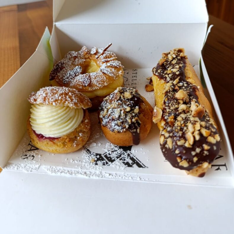 Combo conformado por 4 profiteroles diferentes: -Craquelin: profiterol coronado con una galleta relleno de mermelada de frutos rojos y nata montada -Choux: Profiterol cubierto parcialmente por chocolate semiamargo y avellanas, relleno de nata montada o crema pastelera -Paris Brest: Profiterol con praline de almendras y crema pastelera -Eclair: Profiterol cubierto parcialmente por chocolate semiamargo y avellanas, relleno de nata montada o crema pastelera   *Los productos no incluyen el envío