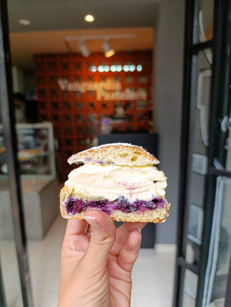 Pan brioche elaborado con mantequilla de vaca relleno de arándanos y embebido de almíbar artesanal de naranja. Nata montada de vainilla y espolvoreado de almendra y azúcar glass. Es una porción personal.